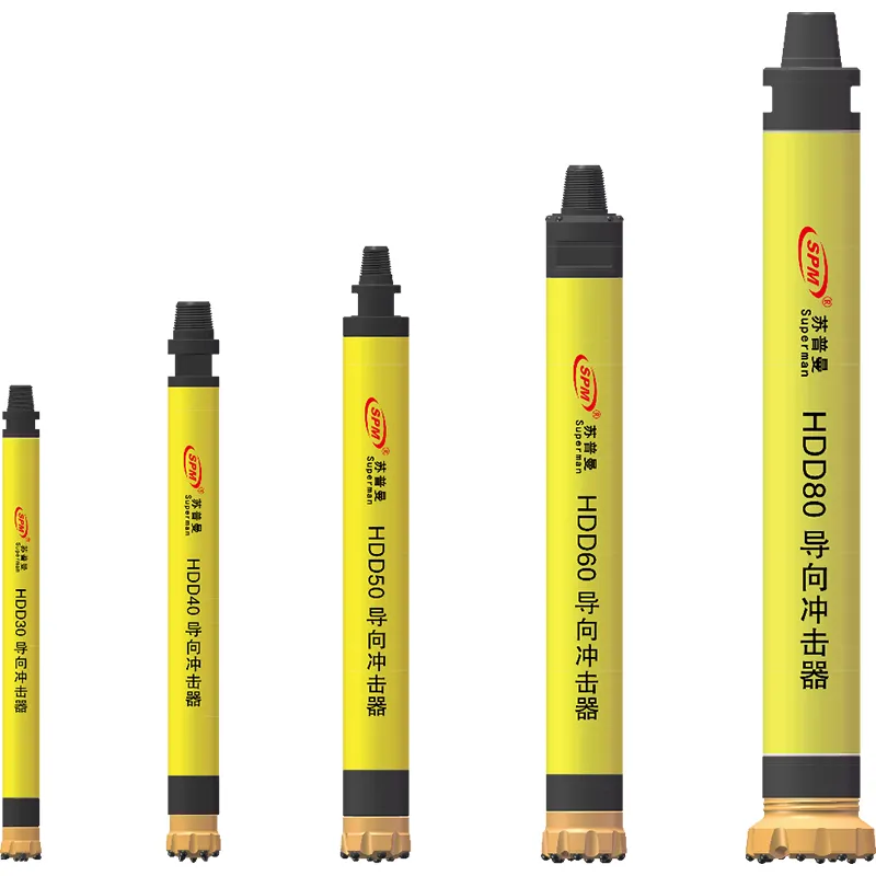 The operating principle of HDD DTH drilling tools is similar to that of conventional down-the-hole systems. A pneumatic or hydraulic hammer is connected to the front end of the drill string, while the rear end is driven by a rotation unit. During drilling, the hammer advances to the bottom of the borehole, where compressed air or hydraulic oil flows through the drill rods into the hammer. The internal air or oil distributor activates the piston, delivering high-frequency impacts to the bit and fracturing the rock. At the same time, the rotation unit turns the drill bit, combining percussive action with cutting forces to achieve efficient rock breaking. The resulting cuttings are then flushed out of the hole by compressed air or circulating drilling fluid.